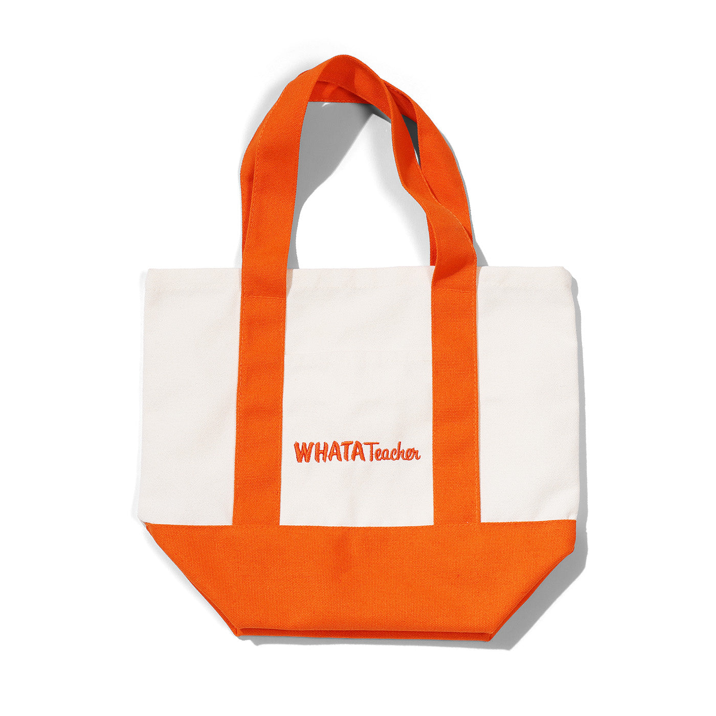 Carry your essentials in style with this charming mini WhataTeacher canvas tote bag. Crafted from durable cream-colored canvas, it features vibrant orange accents on the straps and bottom for a pop of color. The front showcases delicate embroidered WhataTeacher stitching that adds a unique touch. Compact and cute, this tote is perfect for teachers. Ideal for daily use, errands, or as a thoughtful gift.
